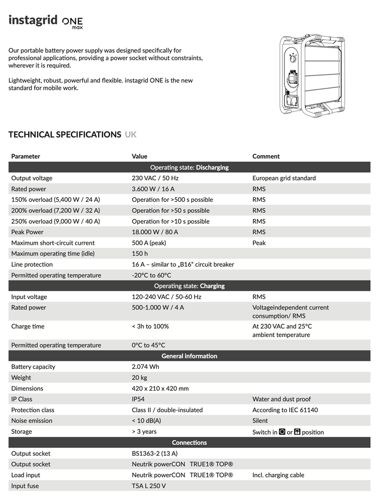 Experience the freedom of power on the go with the Instagrid ONE. Designed for professionals on the go, it delivers reliable, clean energy wherever and whenever you need it. Weighing an ultra-light 20kg, this one-handed portable power solution packs a punch with 3.6kW of continuous power and a staggering 18kW peak power, making it ideal for construction sites, events, travel, production, or any off-grid workspace.
